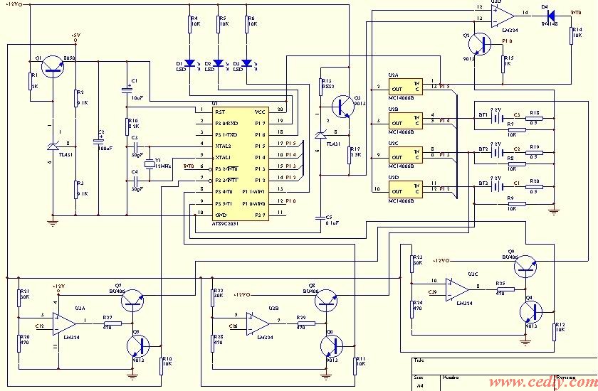 原理:892051用来检测充电负斜率,MCI4066决定采样哪块电池,U3A-C组成充电恒流源。Q3和TL431组成恒流源用来给C5充电,C5电压上升到采样电压时U3D翻转产生中断INT0停掉2051内部定时器,定时器所得即电压,当测到电压连续下降时饱和Q4、Q5或Q6停止充电。